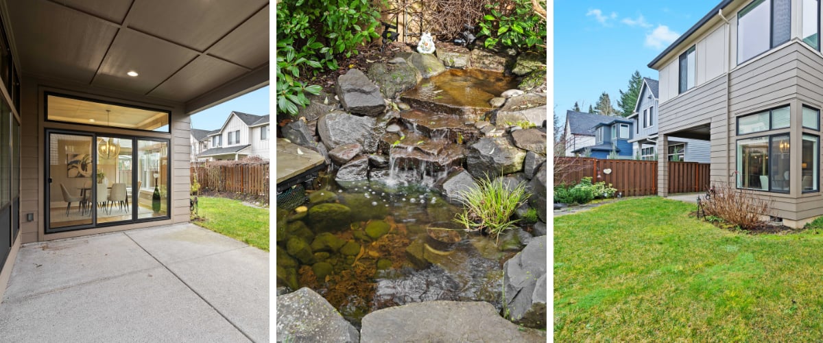 A soothing koi pond adds a sense of calm and charm, creating a backyard retreat that feels private, intentional, and easy to enjoy throughout the seasons.