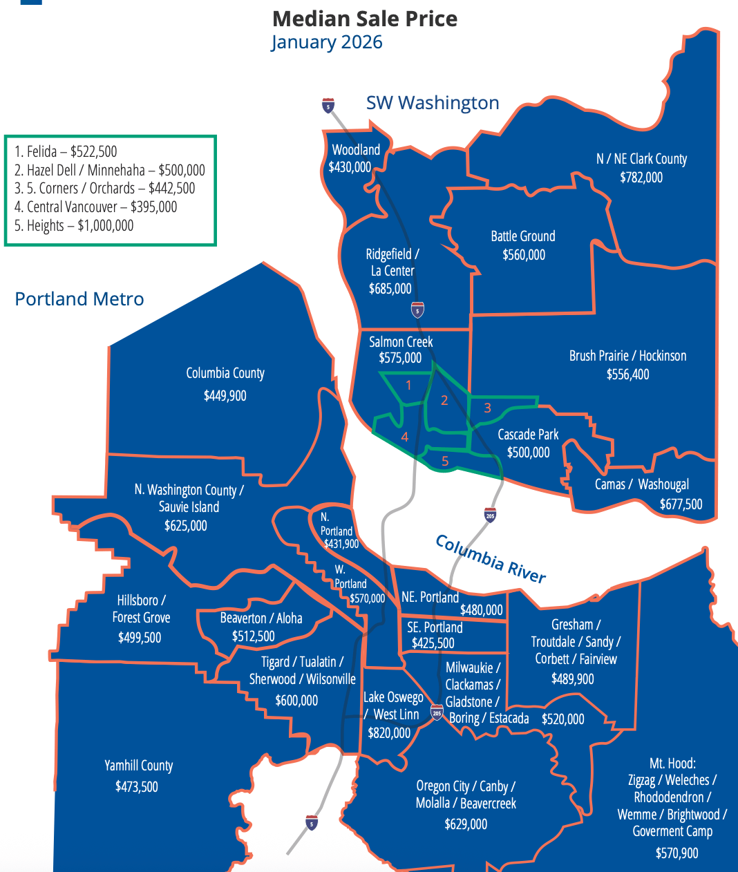 The median sale price for December was reported at $510,000, a 4.7% decrease from last month, and a 5% decrease from January 2025. Lake Oswego / West Linn retained the top median sale price in Portland Metro at $820,000.