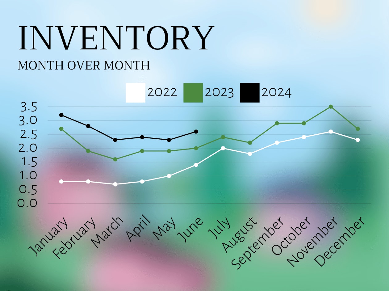 Inventory levels are a leading indicator of market strength. Inventory levels for June were reported at 2.6, meaning if no new homes came on the market, it would take 2.6 months until inventory sold out completely (at the current rate of sales). While 2.6 is significantly higher than inventory in June 2022 and 2023 (1.4 and 2.0 respectively) it’s still historically low.