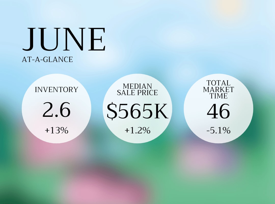 The Numbers At-a-Glance: Compared to May, June reported a 13% increase in inventory (to 2.6 months), a 5.1% decrease in total market time (46), and a 1.2% increase in median sale price ($565,000).